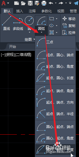 在“默认”选项卡中的“绘图”面板中,单击“圆弧”下拉菜单,然后选择“圆心、起点、长度“。