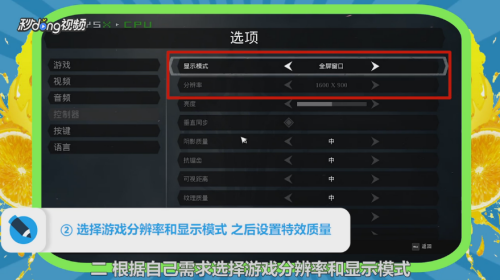 根据自己需求选择游戏分辨率和显示模式,在下方特效选项里选择特效质量。