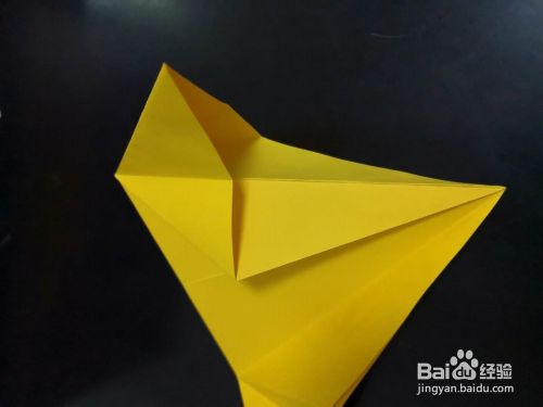 将下方的尖角向上折起,然后以两条斜线的交叉点连成的线为折痕再向下折,调整折痕,将角尖塞入纸缝中。