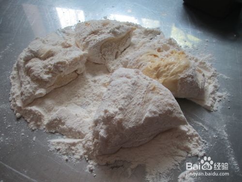 把面团切成小块,把干面粉撒在上面,开始揉面。