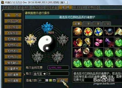 魂兽石分为好多种颜色,效果高低分别为绿色- 金色 - 粉色 - 蓝色 - 白色。获取方式,除了各种怪极其吝啬的掉落外,若是想得到绿色或者金色,你只能在鬼斧神工处烧钱猎取。猎取方式也有两种,一直是手动猎取:每一次都点越级炉子,这种方式是土豪式烧钱,最大程度的效率获取高级魂兽石,省时省事,这种方式不消耗游戏币;