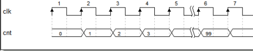以秒个位这个计数器为例,这个计数器加1的条件是什么呢?到了1秒就加1。那我们怎么知道1秒钟时间到了呢?FPGA是通过数时钟周期数来确定时间的。例如下图,假设时钟频率是50MHz,即时钟周期是20ns,cnt是每个时钟加1,则当cnt==99时,就说明数了100个时钟周期,也就是时间是100*20=2000ns了。