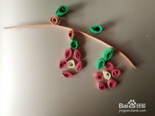 用同样的方式再在制作好的花朵的同一侧的下面相隔一定的距离再制作一个花朵。花朵的心儿和叶儿的部分可以换一些颜色。然后再在橙色的纸条的顶端再制作一个花朵。