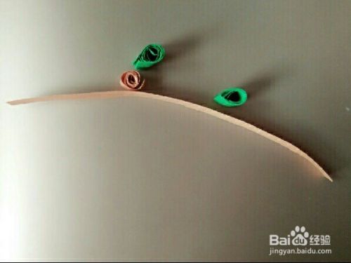 再取出一张绿色的纸条,将这个这个绿色的纸条卷曲成一个圆形纸卷儿,然后再用手将这个纸卷儿的一边捏一捏,捏出一个角来。然后将这个绿色纸卷儿的角朝向橙色的纸条,放在橙色的纸卷儿的右下方。