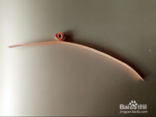 再把橙色的彩纸拿出来,将这张橙色的彩纸向上折叠0.4厘米左右的纸条,用剪刀把这个纸条剪切下来。然后将纸条向上卷曲成一个圆形纸卷,将这个圆形纸卷放在斜着放的纸条的上半部分。