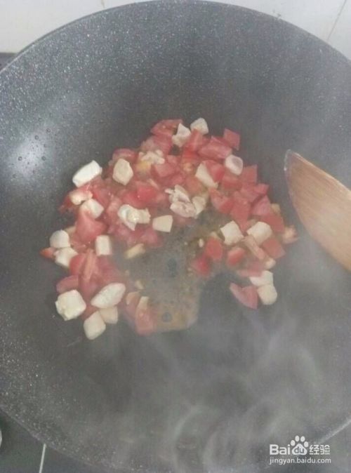 第四步:洗锅放油开火,先将鸡肉炒半熟后倒入西红柿炒几下就倒入适量水(可多倒点,多煮会儿汤更好喝。)