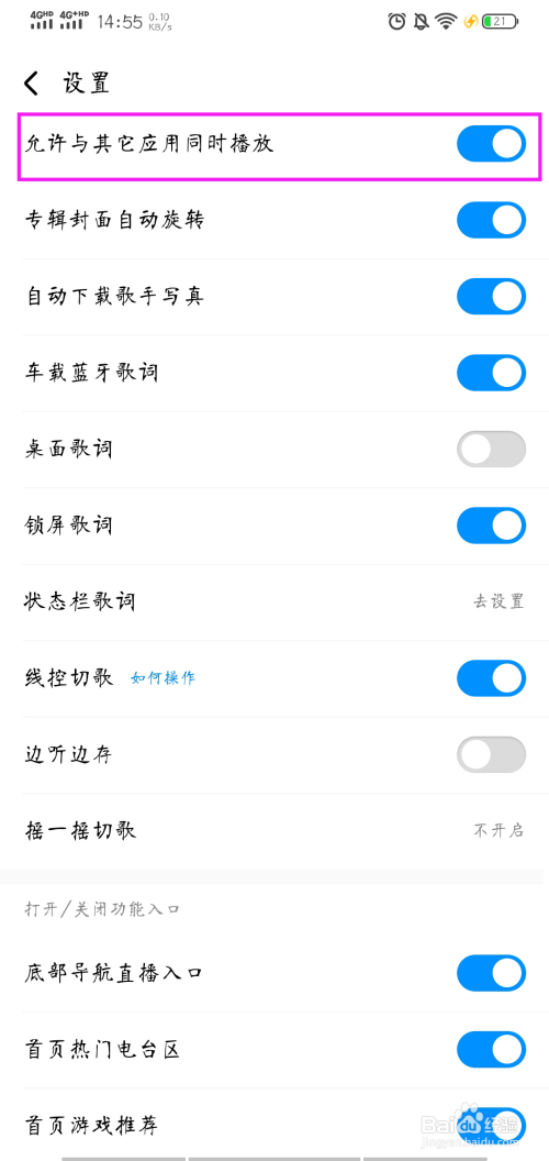 在设置页,找到“允许与其他应用同时播放”,点击关闭即可