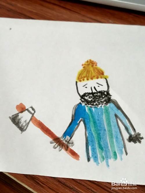 在樵夫的头上,我们画出一顶黄色的帽子。我们同样的将樵夫的身体部分也画出来。