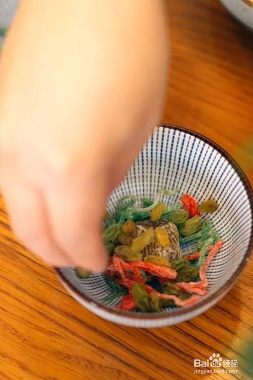 碗中刷猪油,加入蜜枣,红绿丝,葡萄干