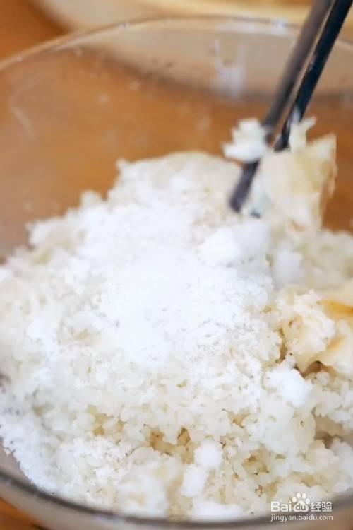 糯米蒸好盛出,放入白糖猪油,捏匀