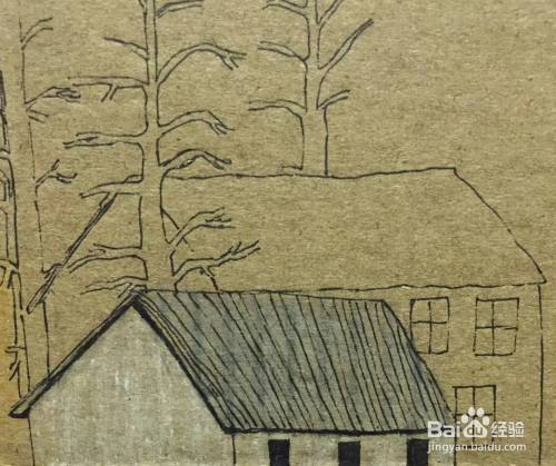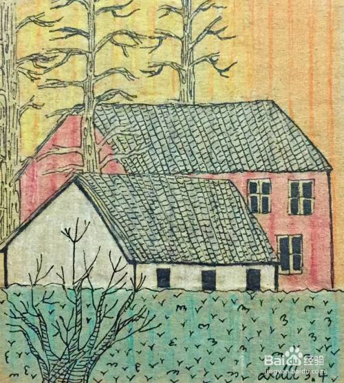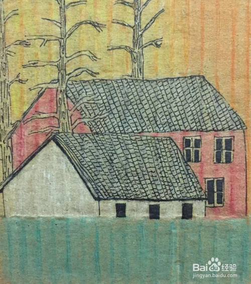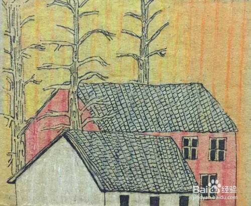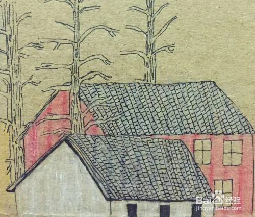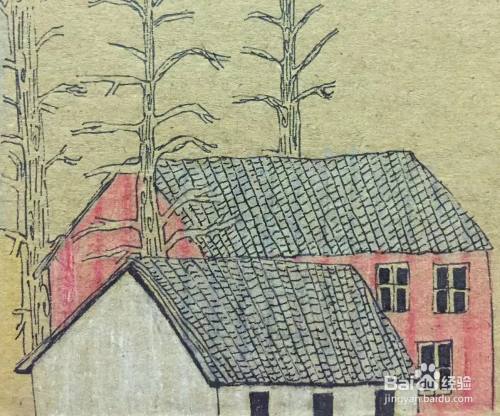 灰色彩铅画笔为屋顶上色,红色彩铅画笔为墙体上色。黑色勾线笔画出房屋周围的树木。