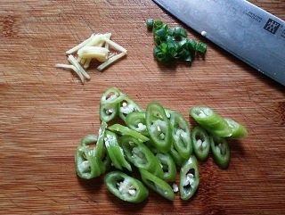 炒锅加热倒油,爆香葱姜、尖椒后盛出