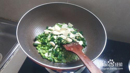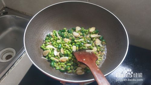 如图,放入青豆、辣椒、生姜,翻炒两下。
