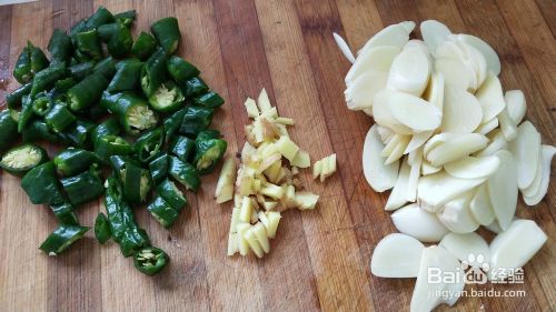 如图,将辣椒、生姜、大蒜洗净并切好备用。