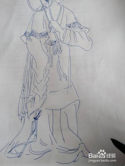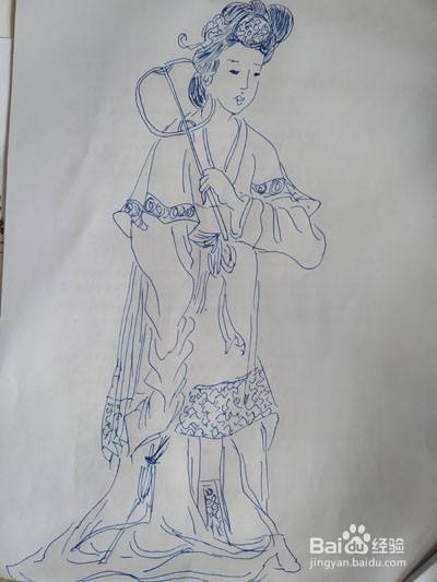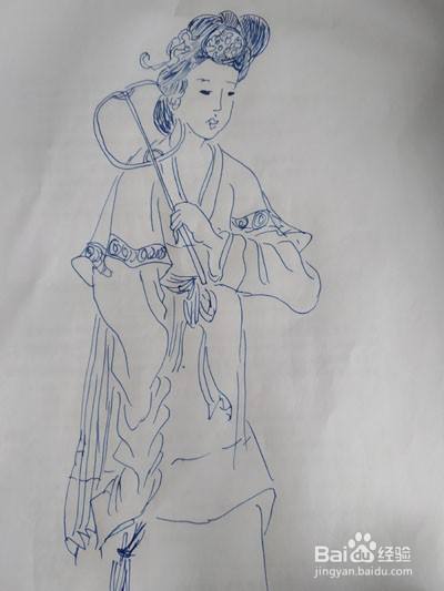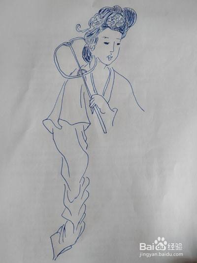 在古代扇子不仅是纳凉的使用工具,也是平时在手中把玩的用具,下面我们用钢笔线条的方法来画一位持扇的女子,具体步骤如下,