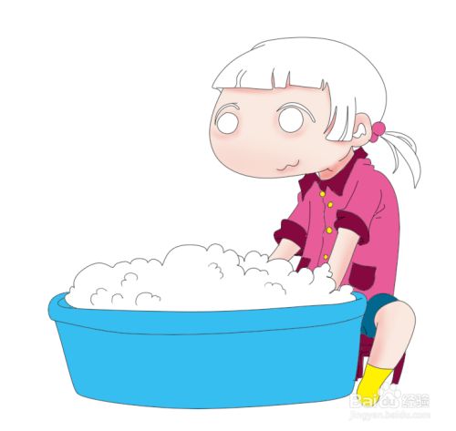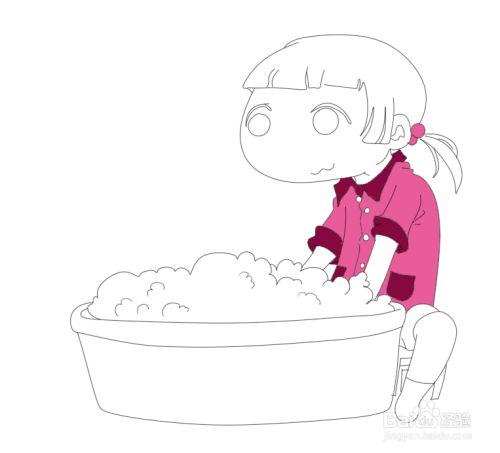 在人物前面画出一个大大的洗衣盆,其上画上溢出的泡沫;画出坐在凳子上的姿态;完成人物线图,如图所示。