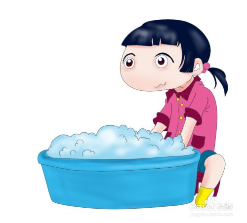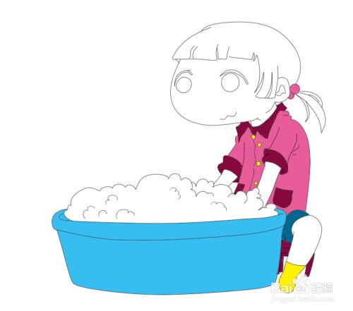 人物的裤子用深蓝色涂上,洗衣盆用蓝色作为底色,鞋子和衣钮用黄色作为底色;如图所示。