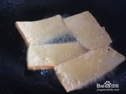待豆腐的一面炸制微黄后,用筷子将豆腐块翻过背面,待两面都炸制成浅黄色,空油捞入盘中。