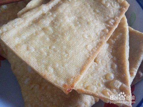 现将薄豆腐用水冲干净,然后空水,再切成5厘米x10厘米的长方块。