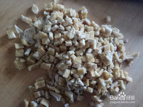 待豆腐块晾凉后,将其放在切菜板上,先切成约0.5厘米宽的细条状,然后再切成小碎丁块。