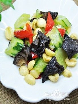 清炒莲子,黑木耳用冷水泡涨,撕小块,黄瓜削皮切小块,红辣椒半个,切小块,大蒜拍碎,切末,锅热后倒油,放入蒜末,煸出香味后倒入黄瓜和黑木耳,中火,翻炒2分钟,倒入莲子和红辣椒,撒入盐,把盐味翻炒均匀即可
