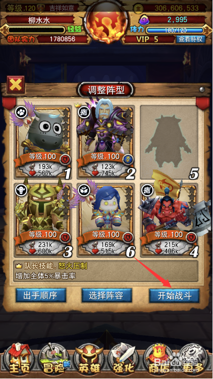 4.按下图所示阵容设置英雄站位和出手顺序,点击开始战斗。