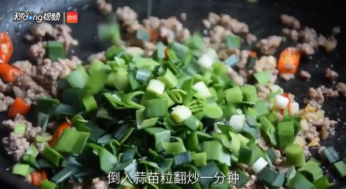 倒入蒜苗粒翻炒一分钟。