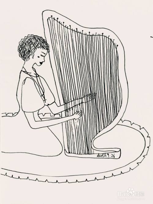 我们画出女子的下半身长裙,我们给竖琴画出框架,在其内侧画出琴弦。具体画法可参见如下图所示。