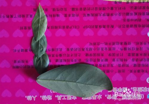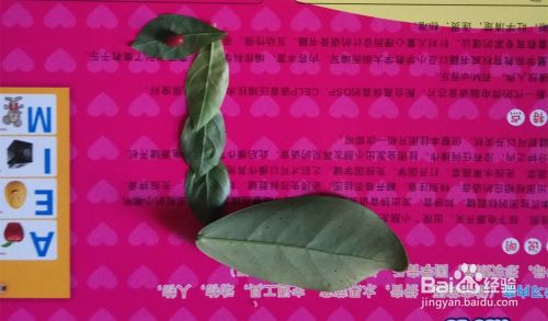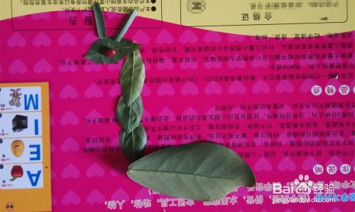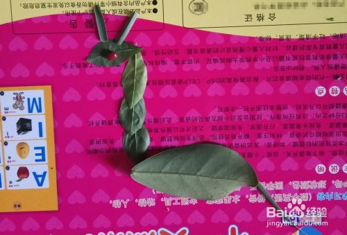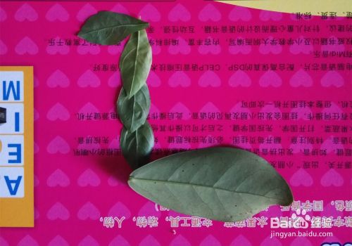 同样小点的叶子作长颈鹿的头,眼睛我就放了一颗红豆(自己想放什么都行),如图所示。