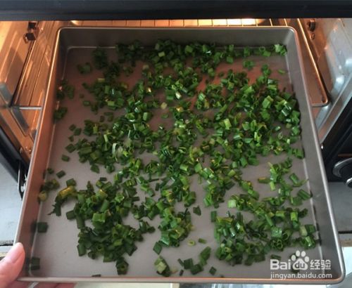 切好的香葱末,倒入烧盘中,120度烤10分钟,烘干水份。