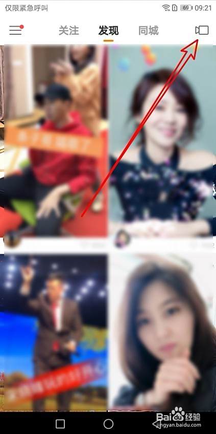 在打开的快手主界面,点击右上角的“拍摄视频”按钮。