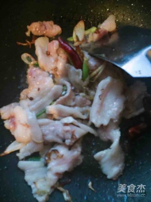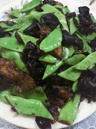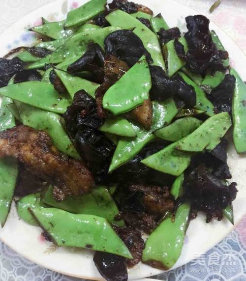 放入五花肉片 煸炒出多余油脂 放入芸豆木耳接着翻炒 翻炒均匀后放一勺豆瓣酱 一勺酱油 翻炒片刻 放盐味精 翻炒均匀后出锅即可