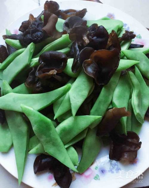 芸豆切段 木耳泡开。锅内烧水 芸豆木耳一起焯一遍 捞出控干水份备用