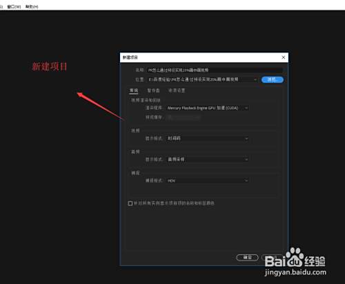 新建一个PR项目,在新建项目窗口中设置PR项目的名称与保存位置等属性。