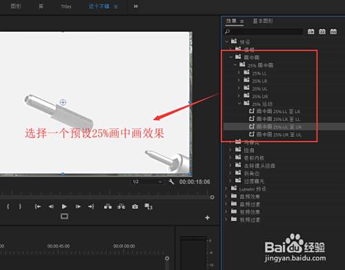打开效果窗口,展开预设,找到画中画中的25%画中画预设,我们会发现这个预设中有很多画中画的预设,选择一个你想要的预设25%画中画。