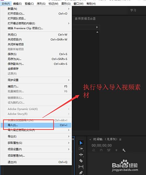 执行文件菜单栏中的导入命令,然后导入两个不同的视频素材到PR项目中。
