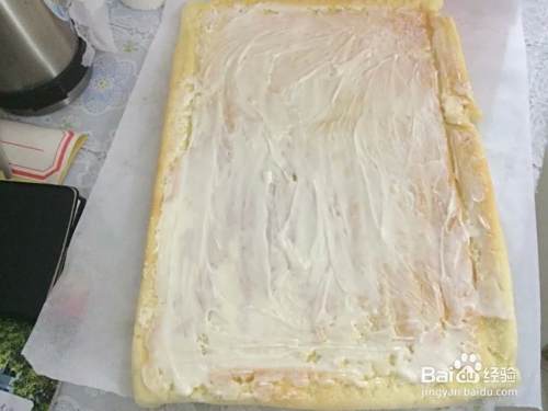 烤好的蛋糕体取出晾凉,将底部油纸撕掉,然后均匀的抹上一层沙拉酱。