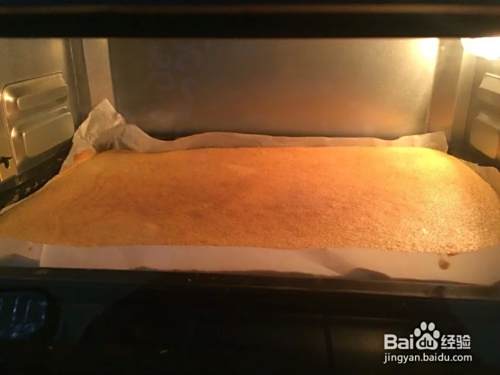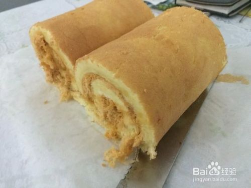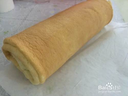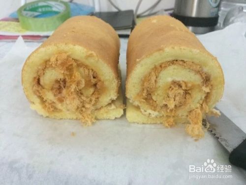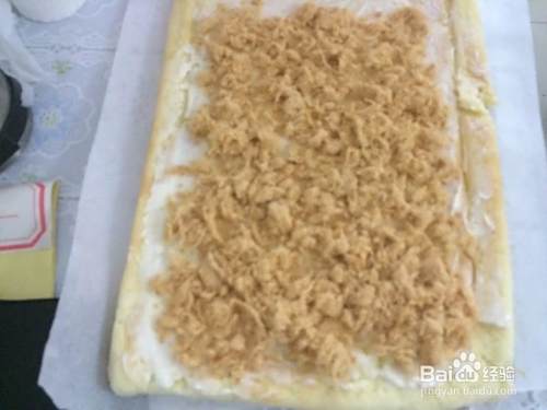 撒上适量的肉松,然后轻轻的将蛋糕体卷起来即可。