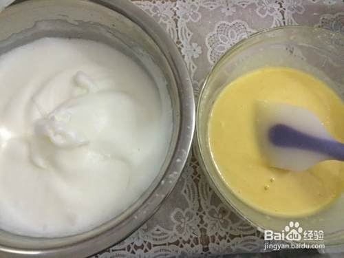 蛋黄糊和蛋白糊用翻拌的手法混合均匀。
