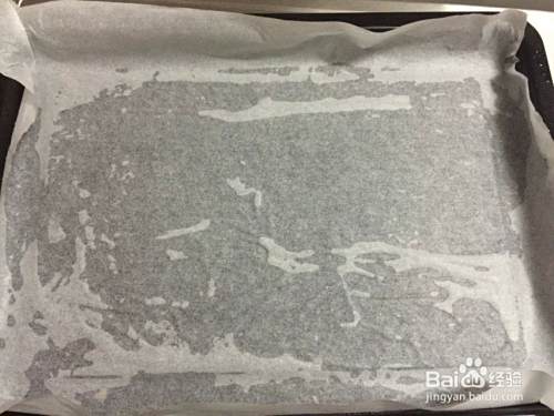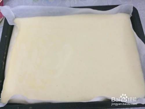 烤盘中垫一张油纸,将混合好的蛋糕糊倒入烤盘中,轻震几下,震出大气泡。