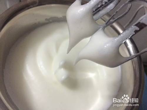 用电动打蛋器打发蛋白,将剩余的三分之二白砂糖分3次打入蛋白中,将蛋白打发到提起打蛋头呈小弯勾的状态。
