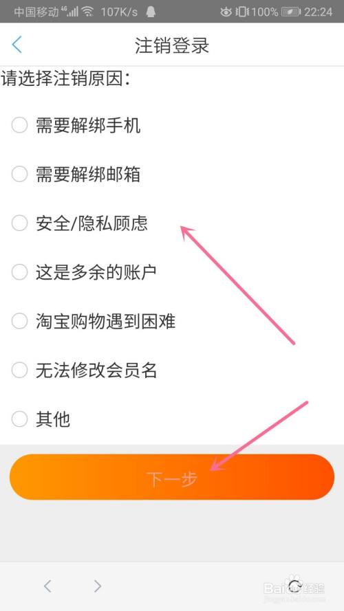 随后进入注销登录的页面选择“注销账户原因”后再选择“下一步”按钮。
