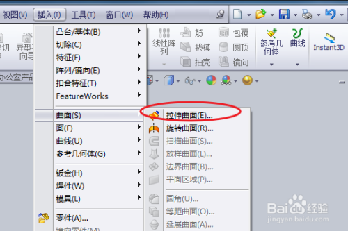 点击拉伸曲面命令,路径:插入--曲面--拉伸曲面。