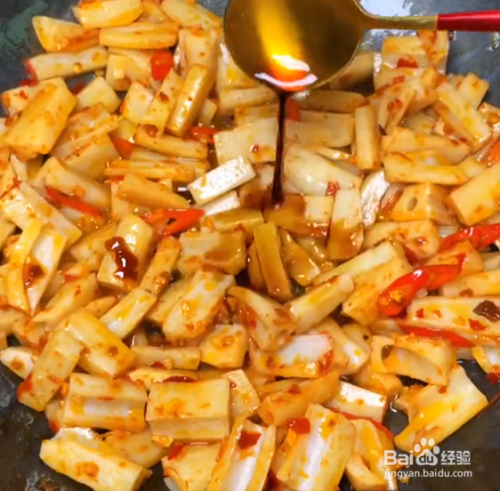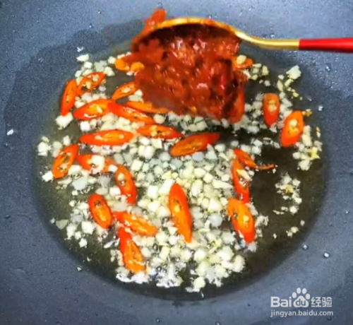 起锅热油,倒入蒜末,小米椒,豆瓣酱炒香