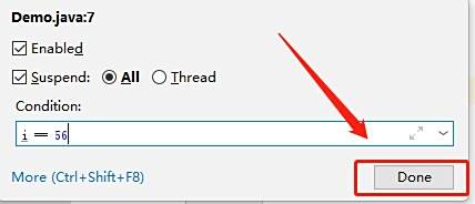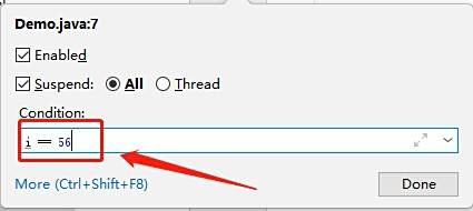 第三步:我们现在如果想“i = 56”的时候让断点停下来,通常我们要手动点击下一步直到“i = 56”, 现在我们可以设置条件断点,首先右键断点打开一个弹窗,如图