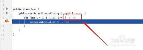 第六步:使用debug方式运行,我们可以看到断点停下的时候i已经等于56了,如图