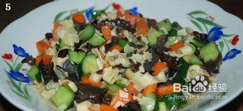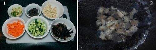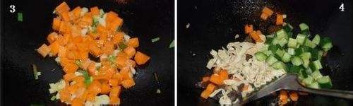 4. 胡萝卜炒八分熟后,加海参、木耳、豆皮、黄瓜丁、少许鸡汤。
