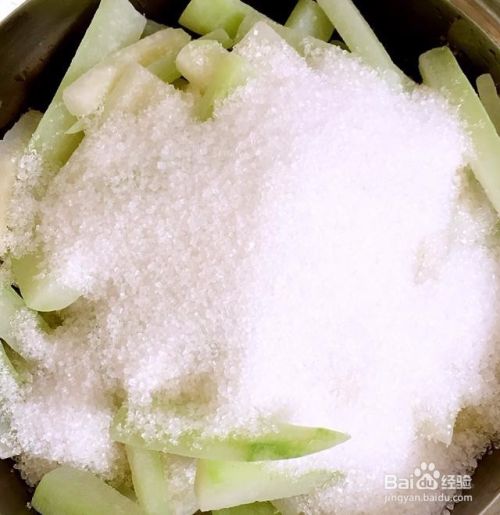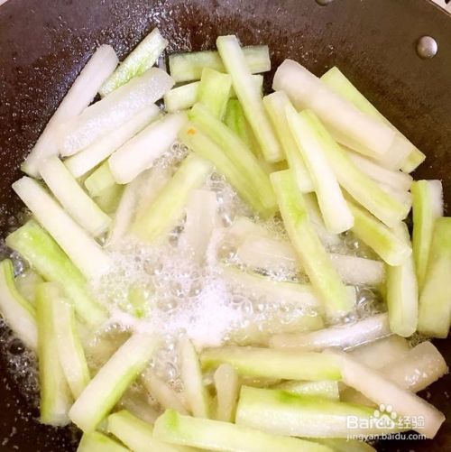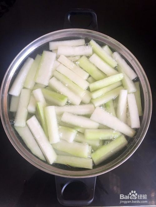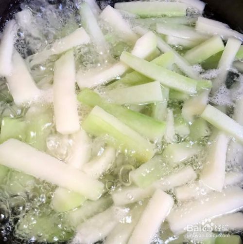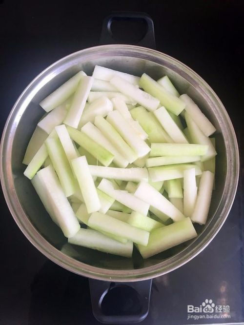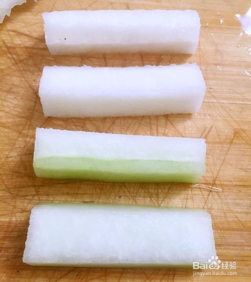 冬瓜去皮去瓤,切小段,长5厘米这样,宽0.5厘米,厚0.5厘米。