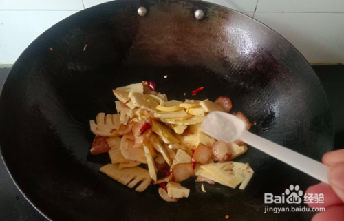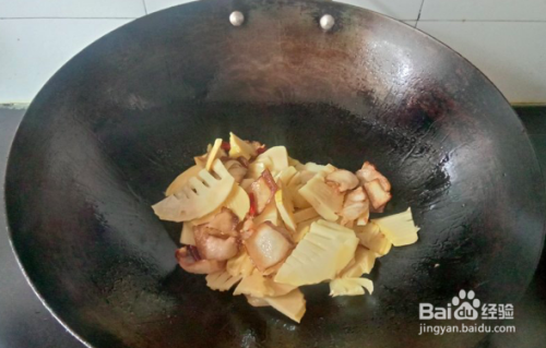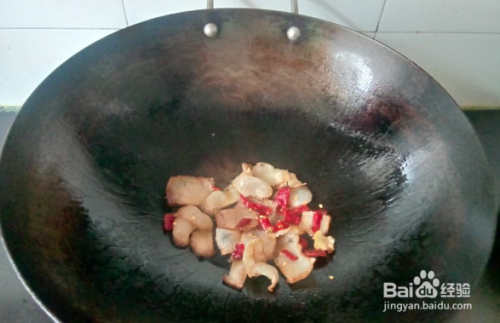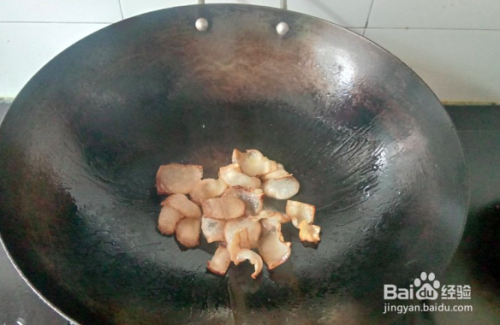 5.锅中彩宙放一点点油放入腊肉煸出油。