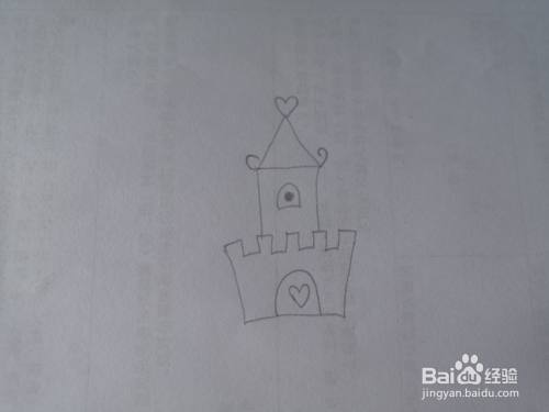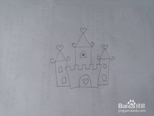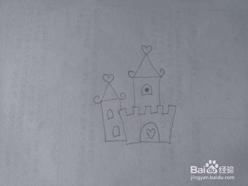 再画出城堡右边的一座城,也是画出门窗,画出城堡顶端的心形。
